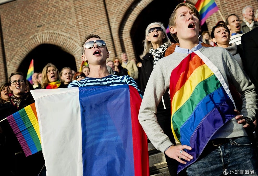 地球圖輯隊2014年 7月,瑞典首都斯德哥爾摩(Stockholm)的人們手持俄國國旗和彩虹旗,高聲唱著俄國國歌,表達對同志族群的支持。