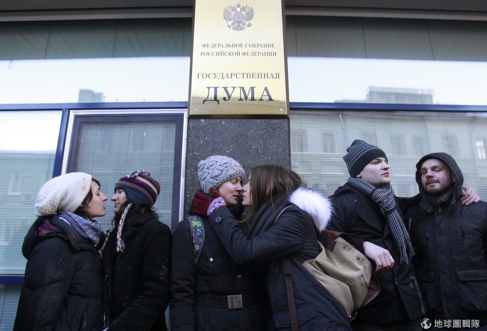 2013年 1月在俄國首都莫斯科街頭,同志維權人士以相互接吻的方式表達對同志族群的支持。《新報》指出,目前他們確定被拘留者包含數名具影響力的穆斯林教士,還有兩位知名的車臣電視台主持人。