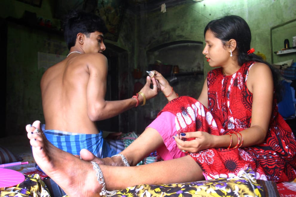 在印度西孟加拉邦首府加爾各答(Calcutta)的紅燈區,一名性工作者拿起保險套給客人使用。