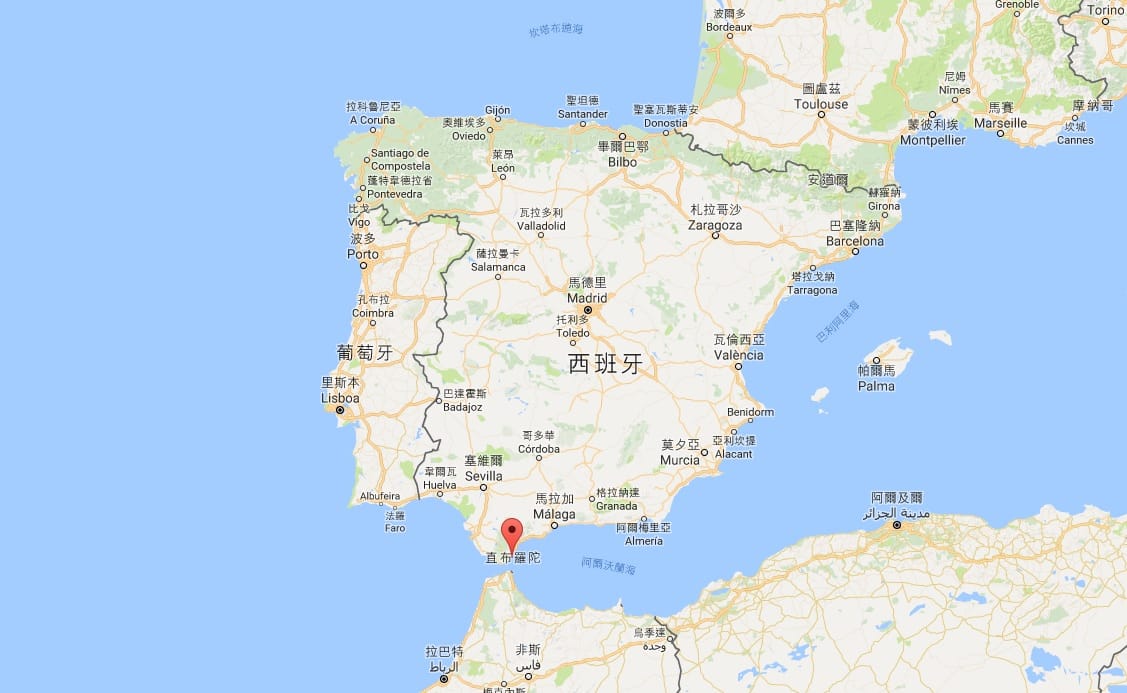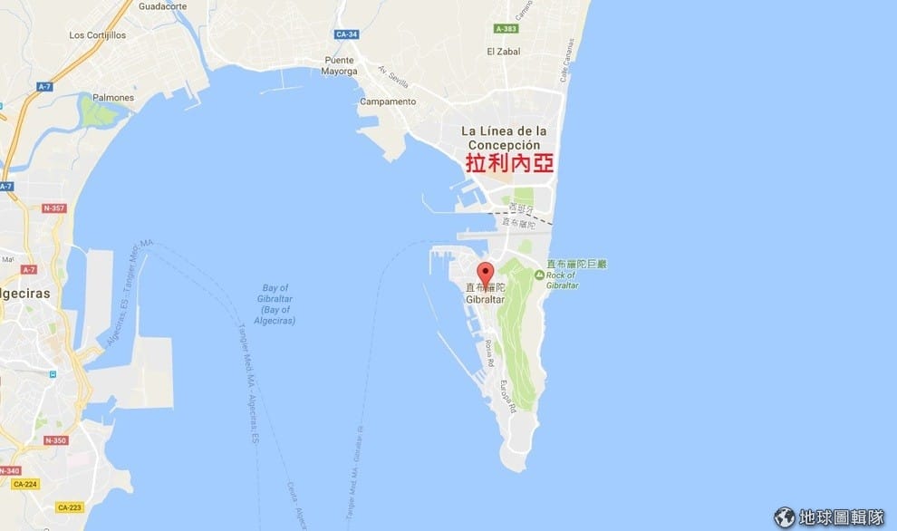 圖中紅色地標處就是直布羅陀,該地是英國 14個海外領地中最小的一個,位於伊比利半島南部,和西班牙的拉利內亞鎮接壤。
