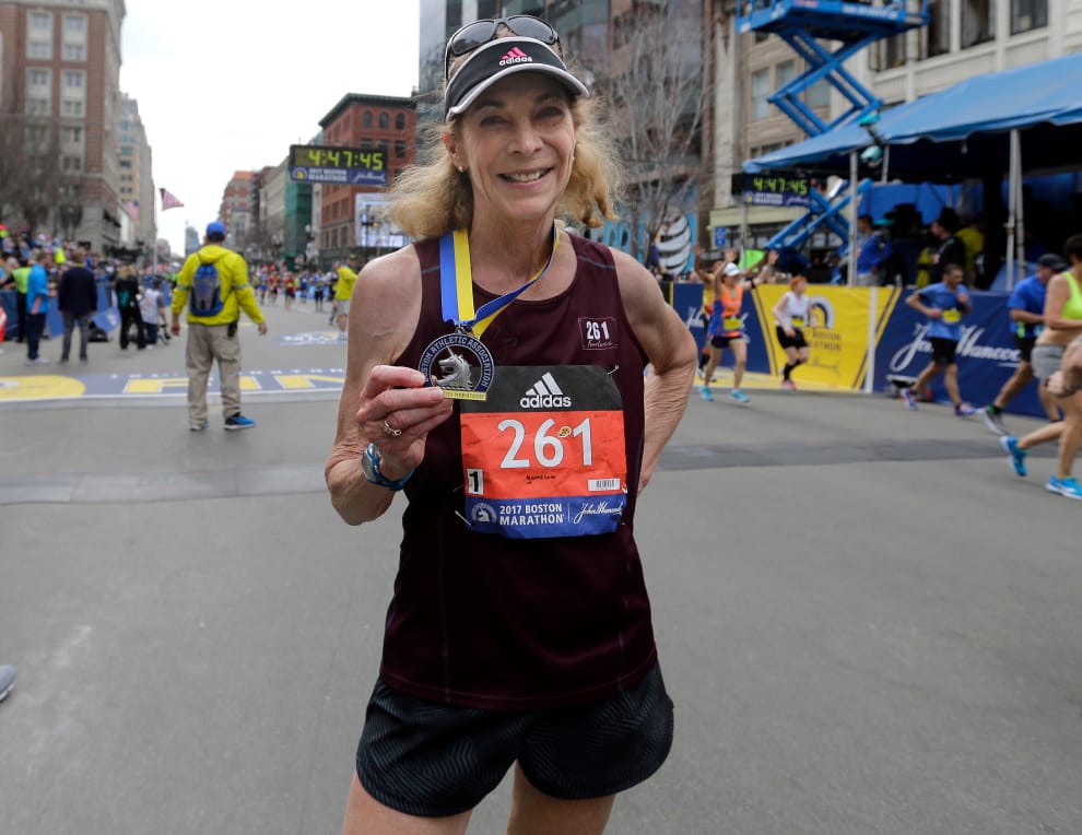 周一,70歲的斯威策重新回到波士頓馬拉松的賽場並成功完賽,她手拿紀念獎牌、別著 261號碼布在鏡頭前留影。