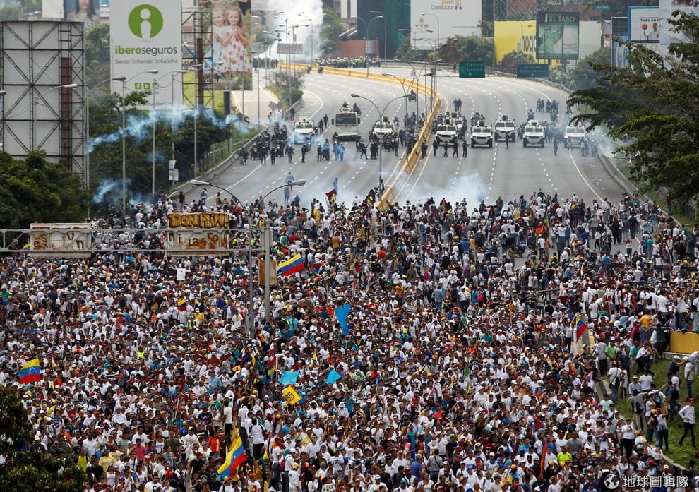 昨日有數萬人走上卡拉卡斯的街頭抗議,但有許多路段已經事先遭到警察封鎖,造成人民與鎮暴警察對峙的情況。