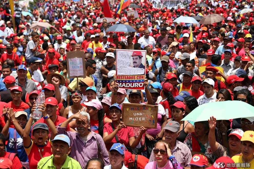 路透社在反馬杜洛示威的一角,也可以看到身穿紅衣的挺馬杜洛民眾,昨日約有千名民眾上街表達對馬杜洛的支持。
