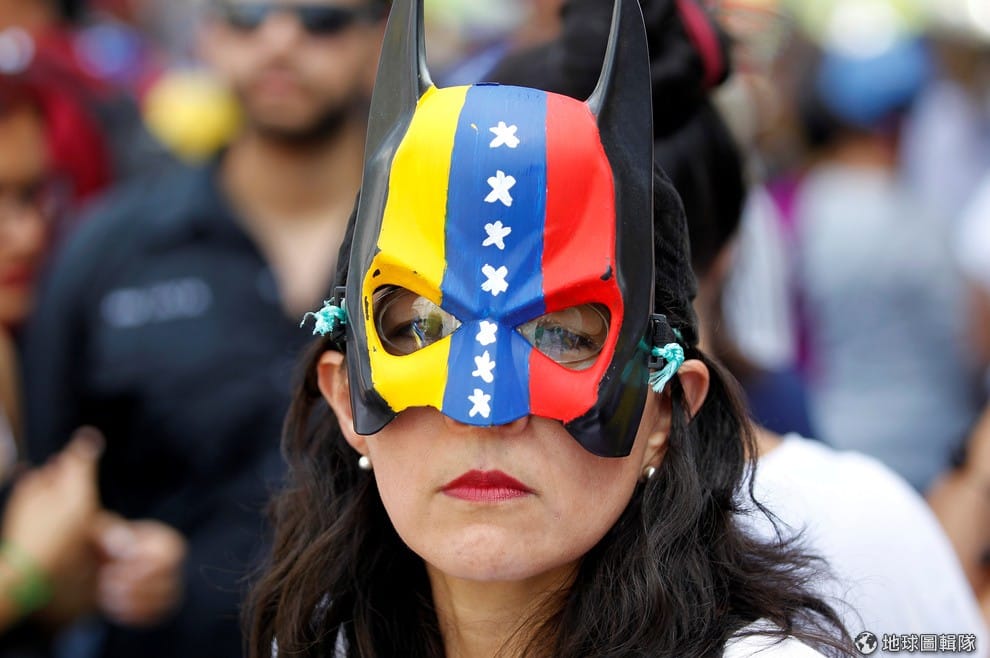 在昨日的遊行中,一名女性帶著畫有委國國旗的蝙蝠俠面罩,上街表達對馬杜洛政府的不滿。