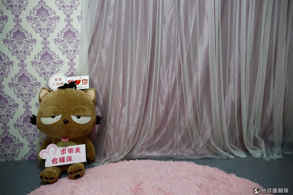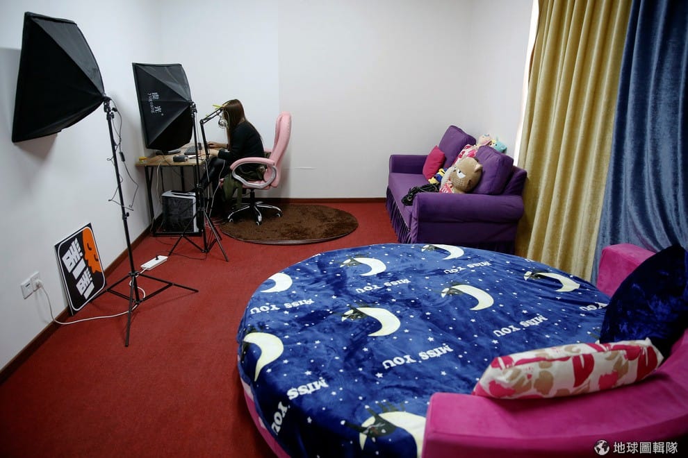 路透社向粉絲撒嬌用的填充娃娃被擺在直播間的床頭。直播主會透過各種展演來賺取粉絲的虛擬禮物。
