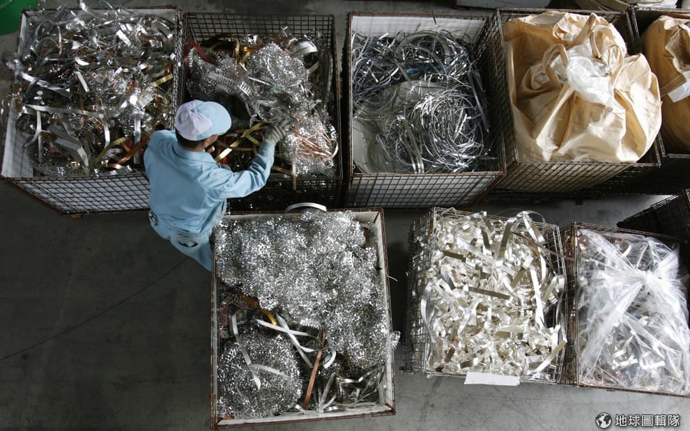 一名工人正在檢查從廢棄手機中取出的銥、金等市價不斐的金屬。