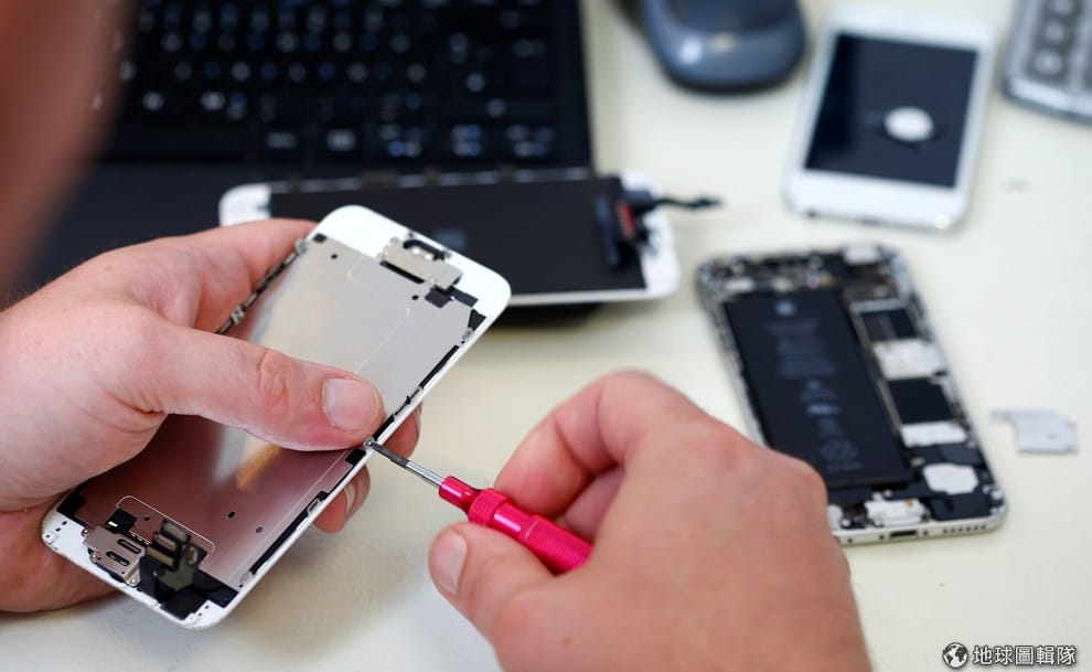 一名工程師正在小心地修理壞掉的iPhone 6。由於iPhone修繕不易,因此有些人覺得蘋果應該降低產品的維修難度,這樣人們會比較願意把手機拿去修而不是換新的,進而減少電子垃圾的產生。