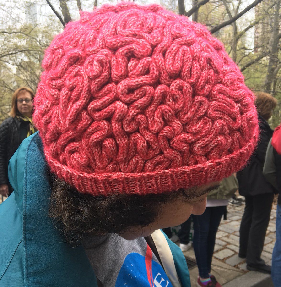 在科學大遊行的現場,一名女子頭戴「大腦毛帽」,吸引了眾人的目光。