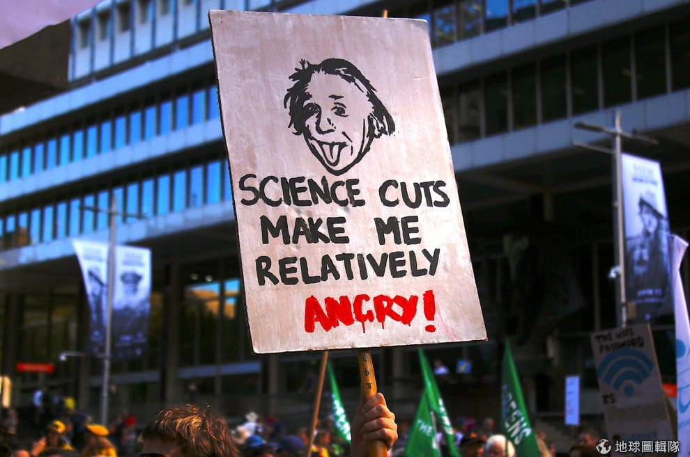 在澳洲雪梨街頭,一名遊行者的牌子上畫了德國科學家愛因斯坦(Albert Einstein)的畫像,底下寫著「刪減科學預算讓我很生氣!」。