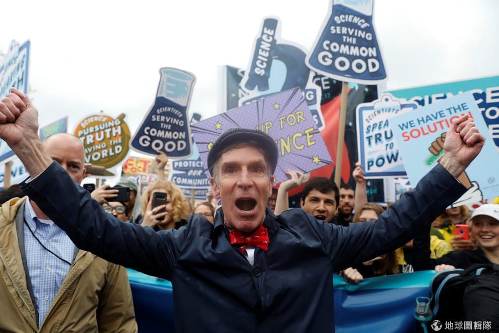 圖中繫著紅色領結的是美國著名科普節目主持人奈伊,他和全球成千上萬名科學家一起上街為科學發聲。