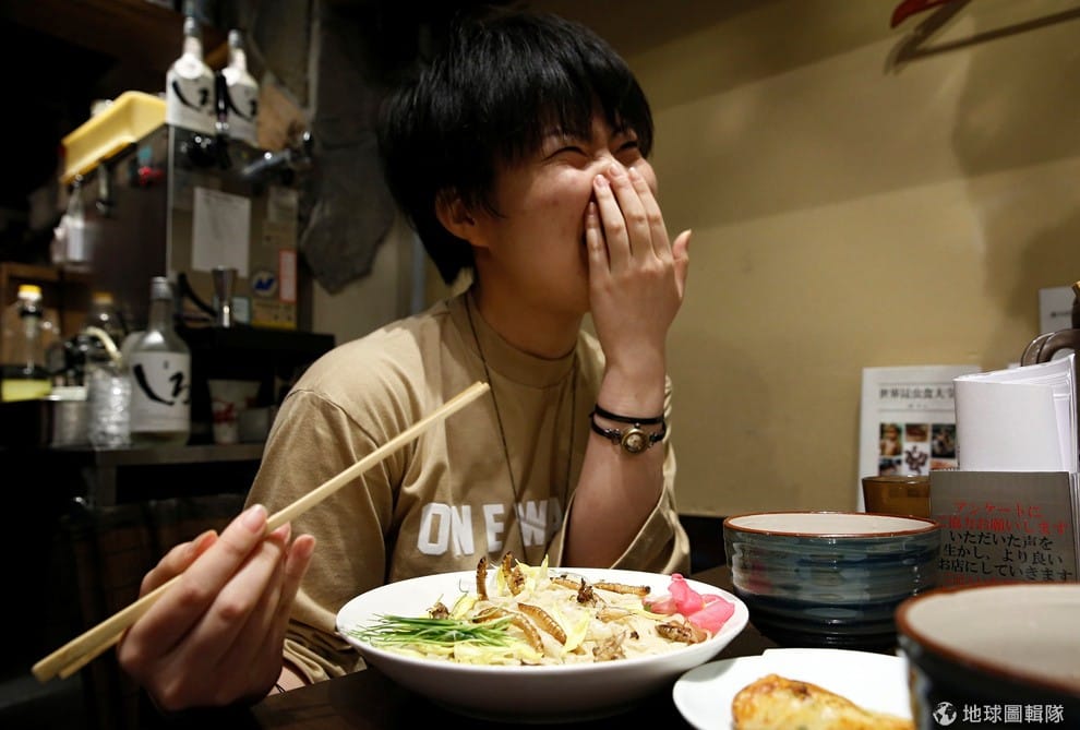 今年 22歲的學生顧客中谷杏璃(音譯,Anri Nakatani)嚐了一口蟲蟲沾麵後說:「蟲蟲已經炸過了,所以吃起來真的很脆,而且沒有怪味道」、「這就像是炸蝦一樣」。