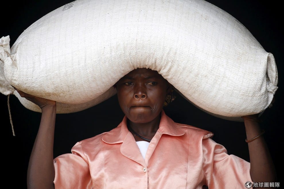 2016年 5月,一名馬拉威女子用頭頂著一袋由世界糧食計劃署發放的米。自從馬拉威在 2012年遭逢經濟危機後,便一直沒有好轉的跡象。