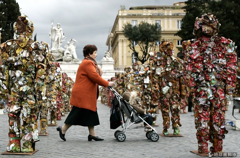 2007年,一名女子推著推車走過羅馬人民廣場,當時廣場正在展出用資源回收的垃圾做成的人像。