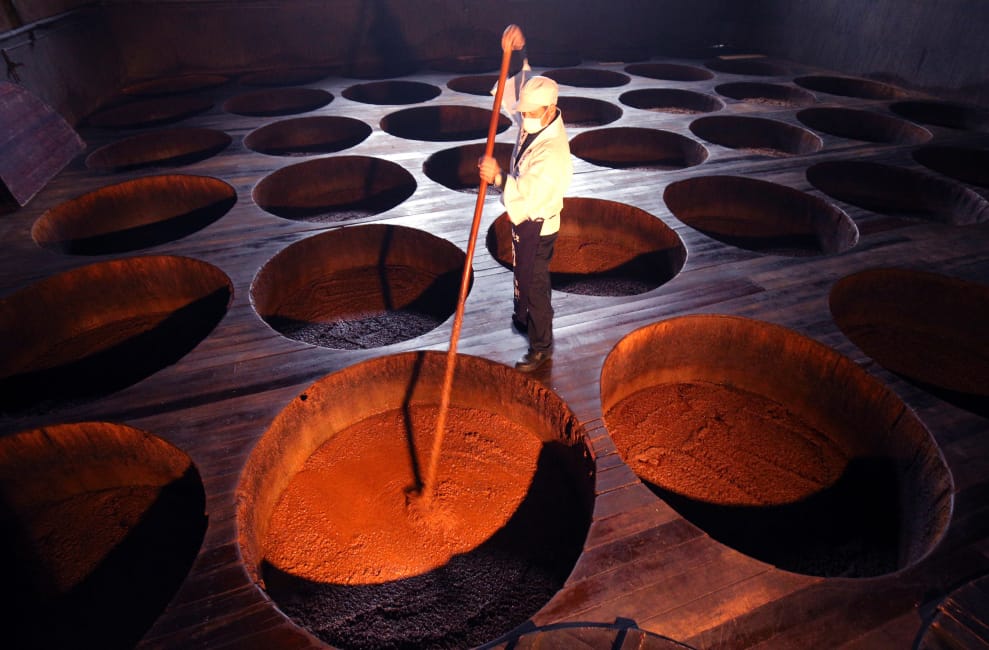 在一間醬油釀造廠內,工作人員利用米麴菌、大豆、烤穀物、鹽水等原料製作醬油。