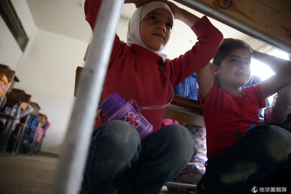 在大馬士革的鄰近城鎮杜馬(Douma),學童正在敘利亞民防組織(Syrian Civil Defence)的指導下進行防災演習。