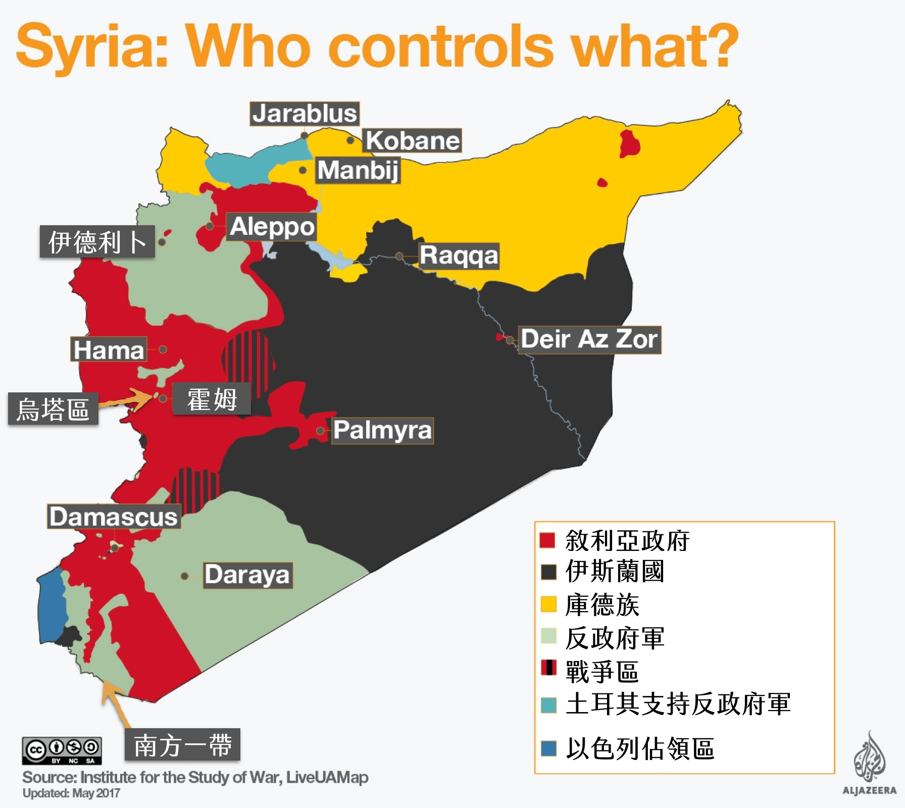 圖為各方勢力控制敘利亞的狀況。中文標記處的即為預計規劃為「降溫區」的地方,不過確切邊界還沒有擬定出來。