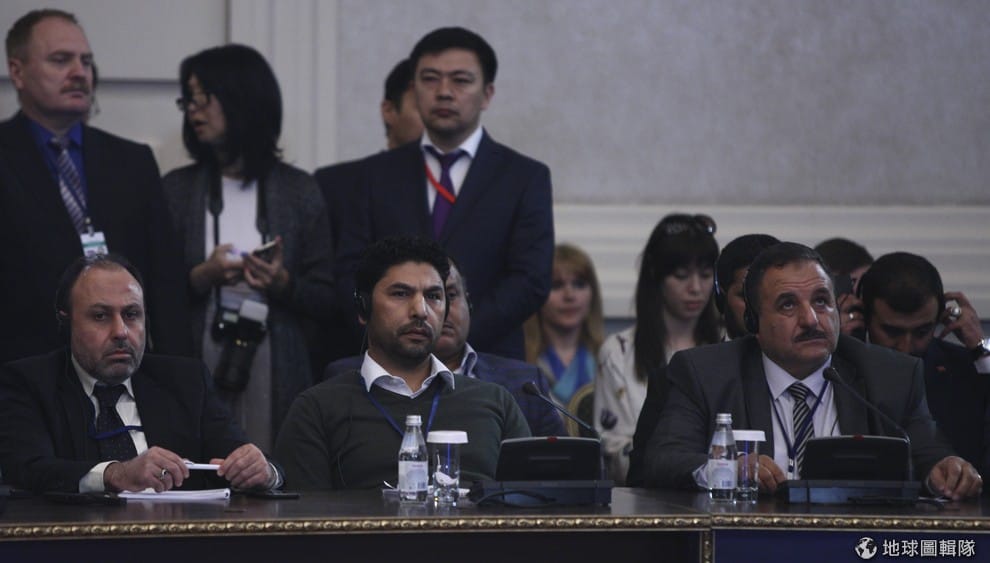 路透社敘利亞自由軍的發言人柴德(Osama Abu Zaid,座椅中間)也出席了這場停戰協議,相較來說,反政府軍各方勢力對設立「降溫區」的看法分歧。