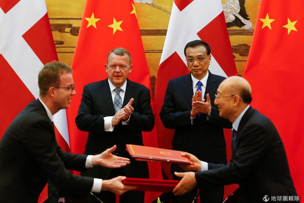 圖為丹麥首相拉斯穆森(左二)在本月 3號出訪中國,並與中國國務院總理李克強(右二)簽訂貿易協定的畫面。兩國正在積極發展雙邊關係。
