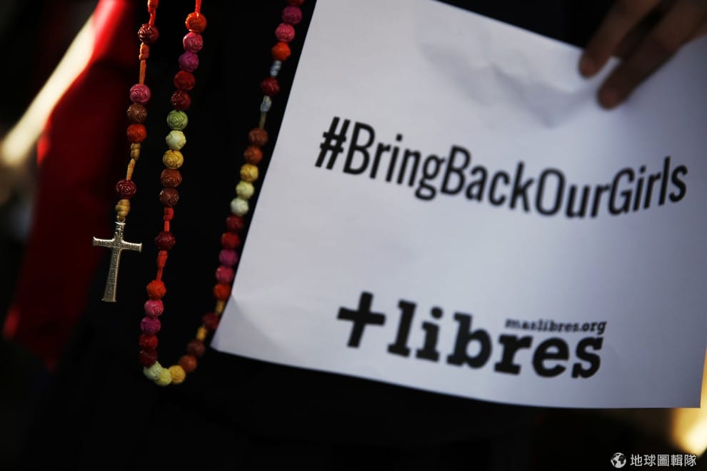 圖為 2014年5月,在女學生遭到綁架後,人們上街示威表達對女學生的支持,也希望政府能有所動作。示威者手上的標語寫著「#帶回我們的女孩」。