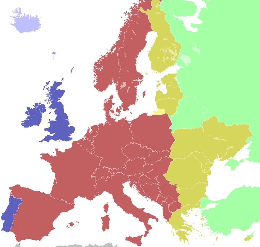 從這張歐洲時區圖可以發現,原本應該和英國和葡萄牙一樣過著深紫色的GMT的西班牙,卻和德國一樣被漆成了代表CET的紅色。