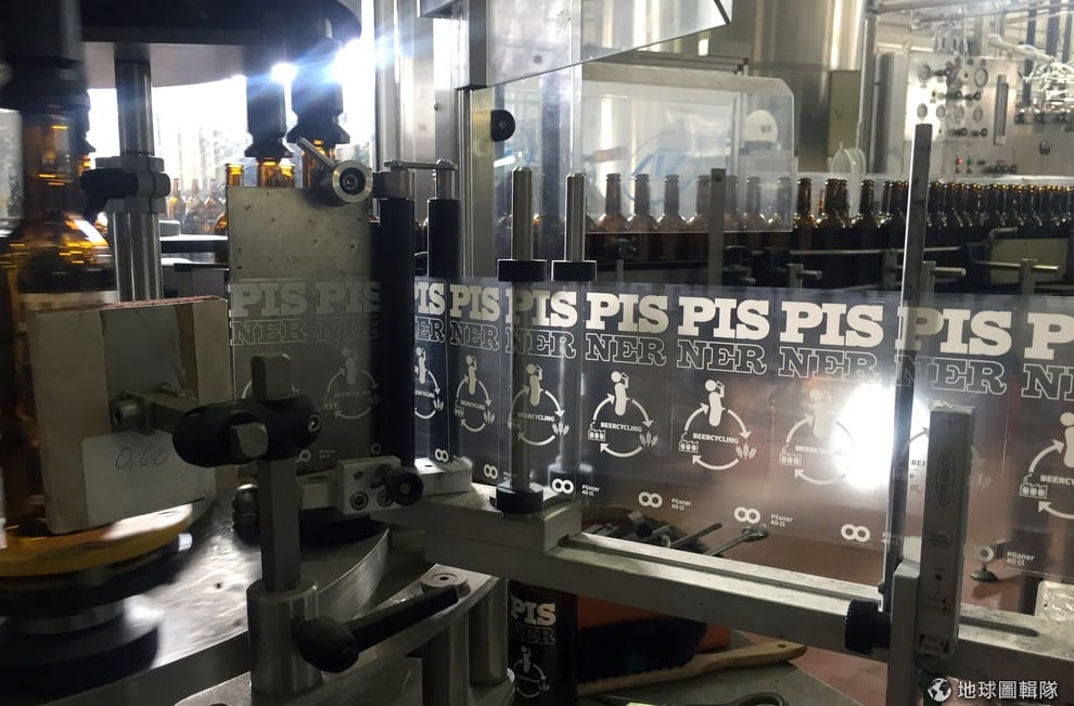 路透社成排的「皮斯尼」酒瓶在機器上被依序貼上標籤,上頭也能看到「尿源回收」示意圖。