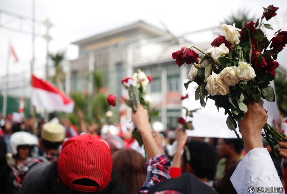 鐘萬學的支持者拿著紅白相間的玫瑰,在法庭外表達對鐘萬學的支持。紅色與白色是印尼國旗的顏色,也是示威過程很常被拿出來的代表色。