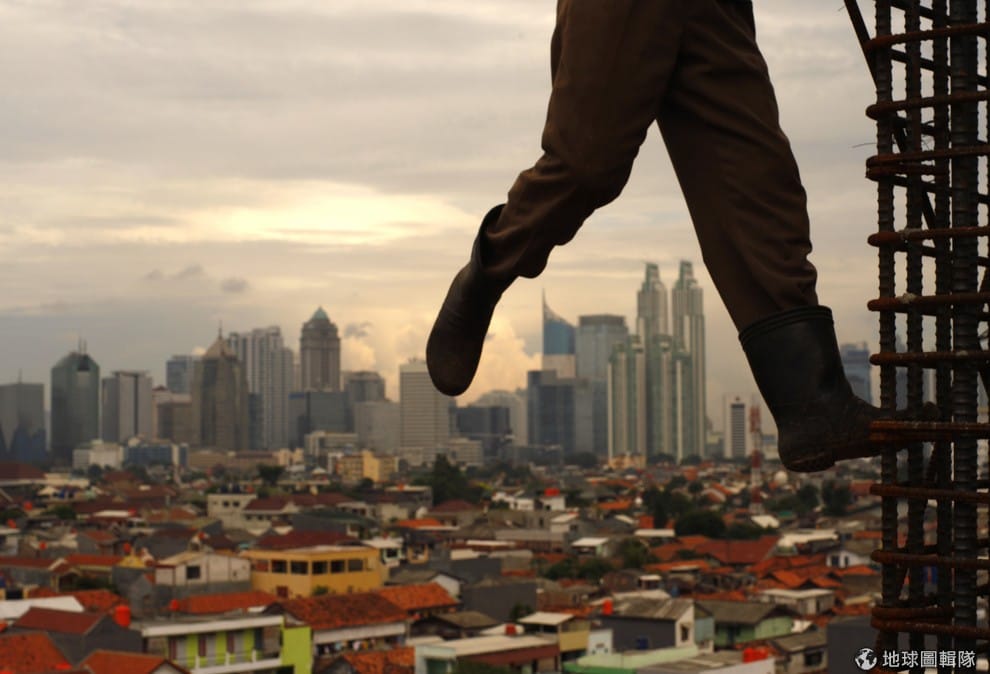 一名印尼工人正在建築鋼筋間走跳。《半島電台》記者費森認為,雖然有一部分的人對判決結果歡欣鼓舞,但肯定有非常多人會質疑判決結果。