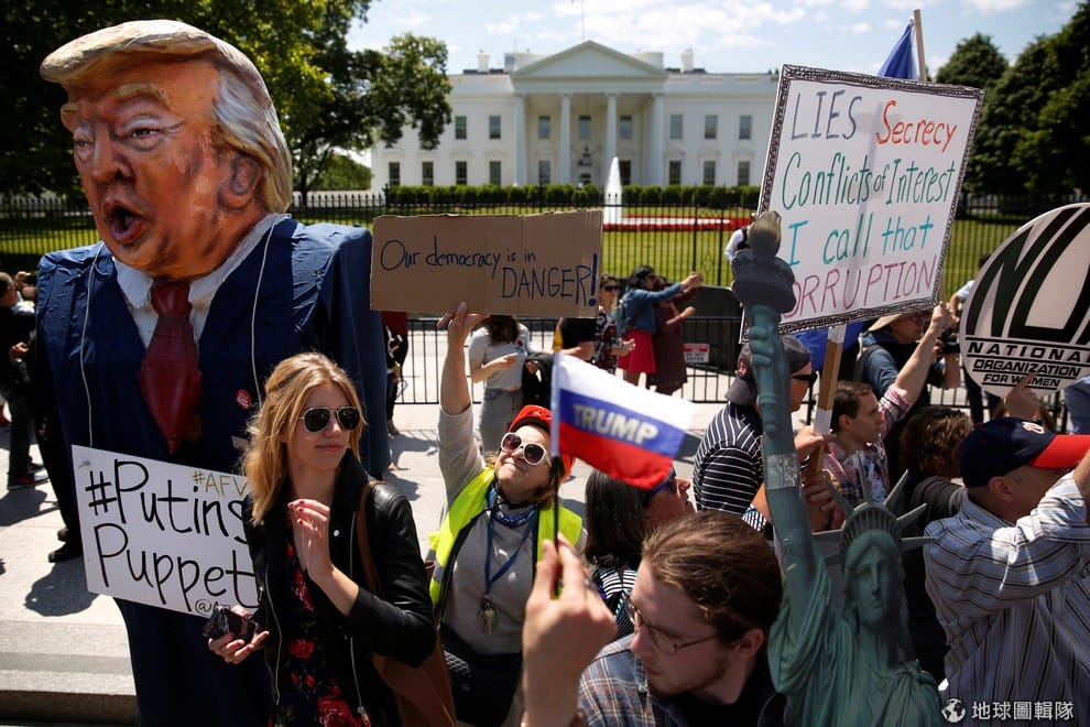在川普開除科米後,白宮外齊聚抗議民眾,他們認為川普競選團隊在去年大選時和俄國共謀操縱選情,民眾製作的川普娃娃上被掛上了寫有「普亭的傀儡」字樣的標語,也有民眾高舉寫有「我們的民主深陷危機」字樣的紙板。