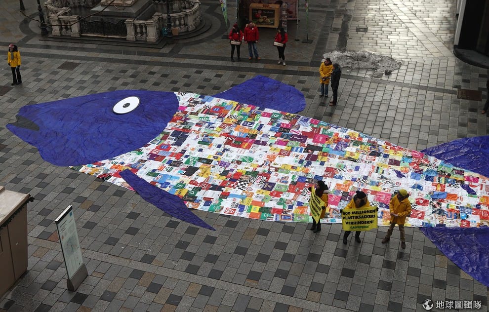 在 2015年奧地利維也納街頭,綠色和平組織的成員用 800個塑膠袋縫製成一條大魚,抗議海洋中塑膠汙染的問題。