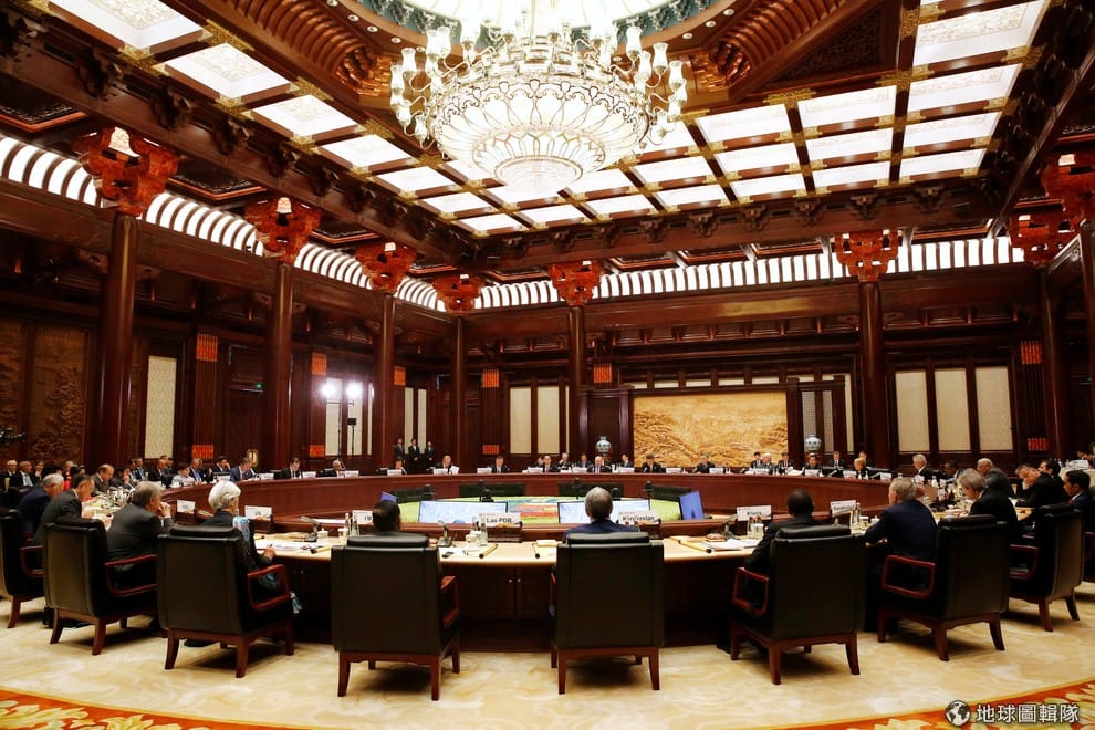 圖為高峰會第二天,與會國元首、政要齊聚一堂開會的畫面。一共有 29個國家前來參加,而聯合國、世界銀行、國際貨幣基金組織(IMF)也有派駐代表團。