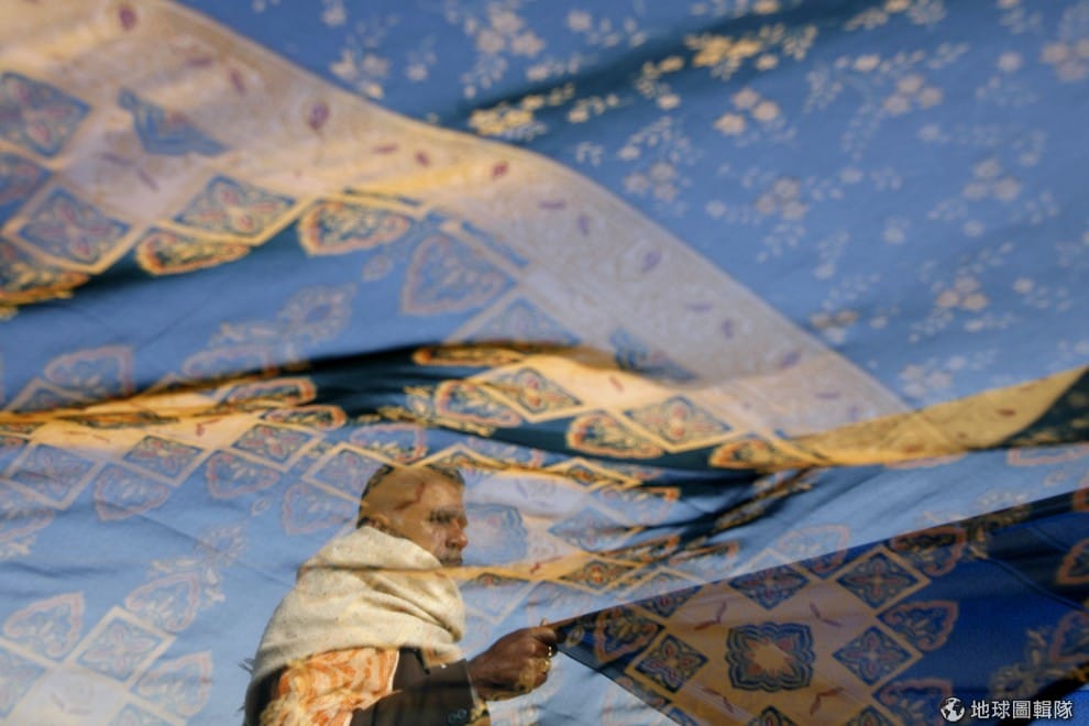 2007年 1月,一名印度教信徒站在曬衣場上吹風。
