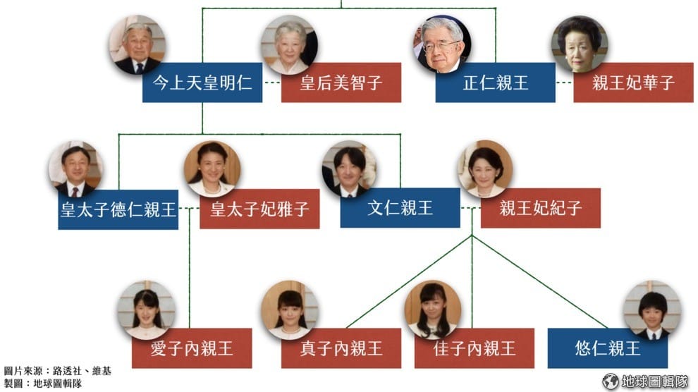 圖為日本皇室部分家系圖。目前能繼承天皇的順序分別是 57歲的皇太子德仁親王、51歲的兄弟文仁親王、文仁親王兒子,今年 10歲的悠仁親王、明仁天皇的兄弟,今年 81歲的常陸宮正仁親王。