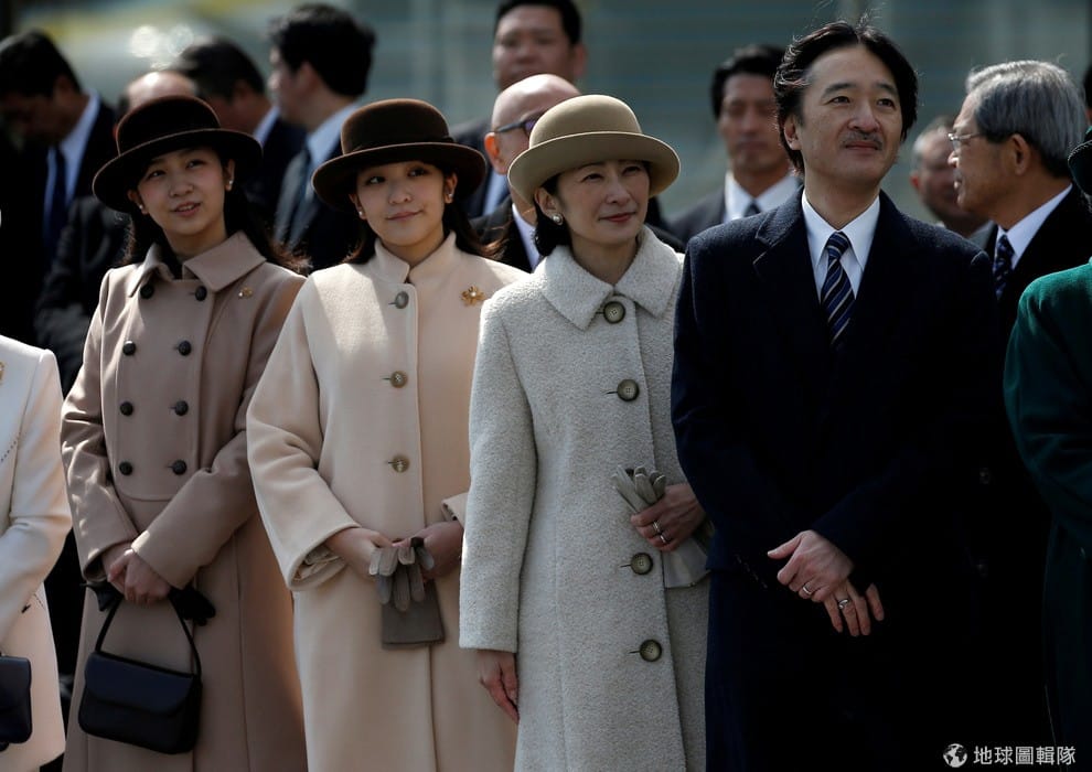 2017年 2月,日本皇室成員在東京目送明仁天皇前往越南訪問的專機。圖右到左分別是秋篠宮文仁親王、親王妃紀子、真子內親王、佳子內親王。