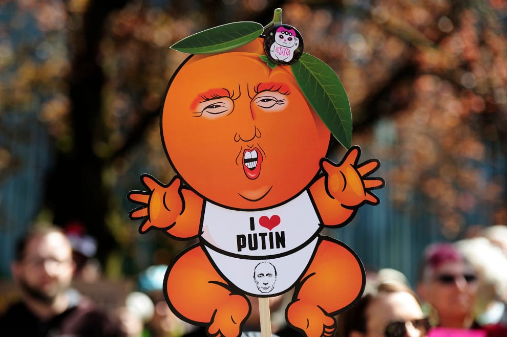 去年美國總統大選,俄國駭客操弄大選情勢的新聞鬧得沸沸揚揚,外界指控川普競選團隊與俄國共謀贏得大選。2017年4月15日,在奧勒岡州的波特蘭市,要求川普公布納稅明細的民眾高舉將他描繪成橘子寶寶的牌子,他的衣服上寫著「我愛普亭」,褲子上則印著普亭的肖像。