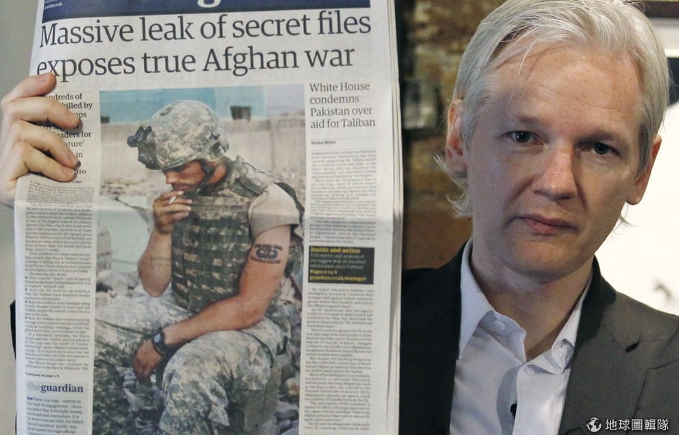 2010年,阿桑奇公布了美國在阿富汗戰爭中可能犯下戰爭罪的資料,當時他手持《衛報》的報紙發布記者會。
