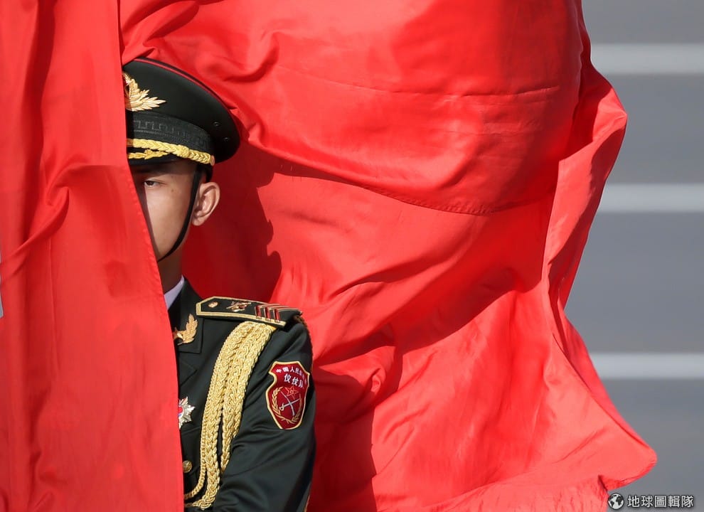 一名中國軍人手拿紅色的五星旗,隨風飄揚的旗幟遮住了他的臉。近日,《紐約時報》獨家披露CIA線人在中國被殺害和監禁,引起軒然大波。