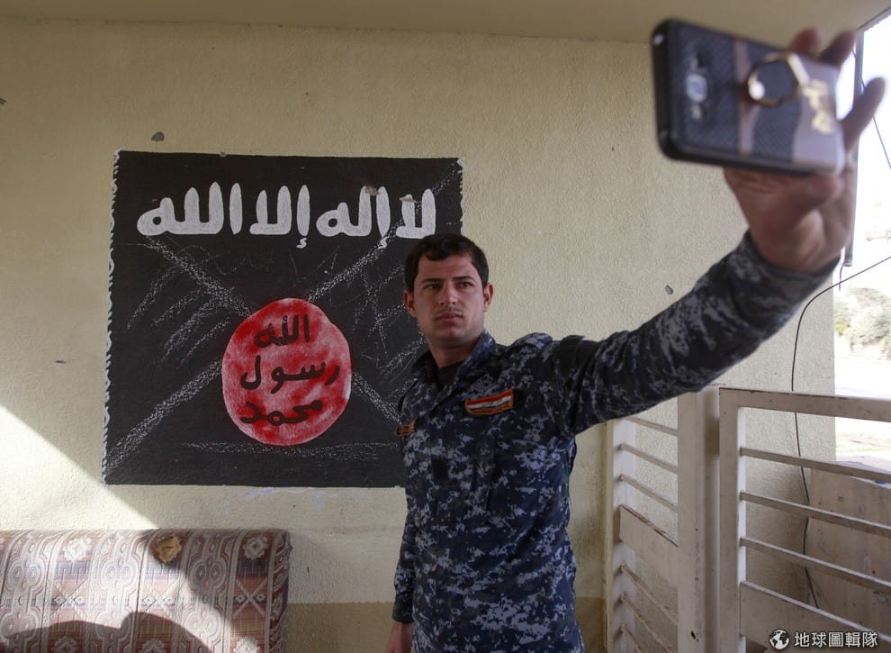 目前,敘利亞和伊拉克仍有伊斯蘭國的勢力,一名伊拉克軍人在前線和伊斯蘭國留下來的旗幟自拍。面對去不了敘利亞或伊拉克的恐怖分子,伊斯蘭國鼓勵他們待在國內執行恐攻。