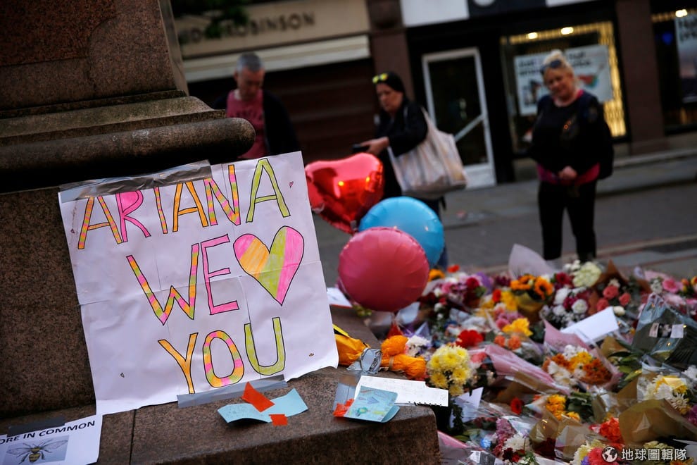 在曼城市中心出現了悼念爆炸案罹難者的花束、標語和氣球,這起爆炸案中許多罹難者都是年輕人,他們剛剛參加完美國流行歌手亞莉安娜的演唱會準備返家。