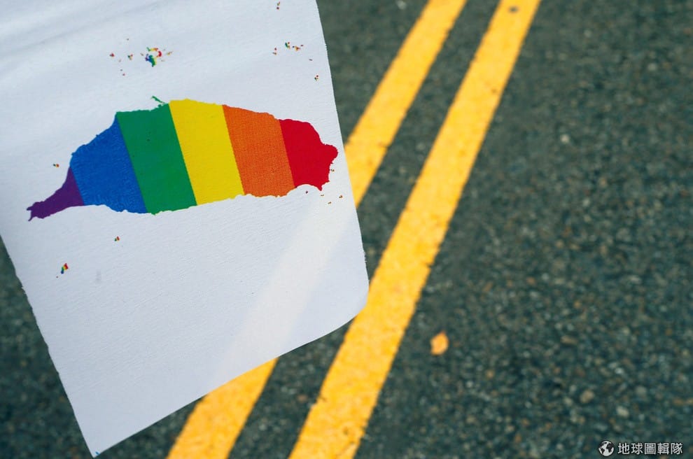 現場也有人發放台灣形狀的彩虹旗,沒被拍到的部分則寫有「求同存異」的字樣。