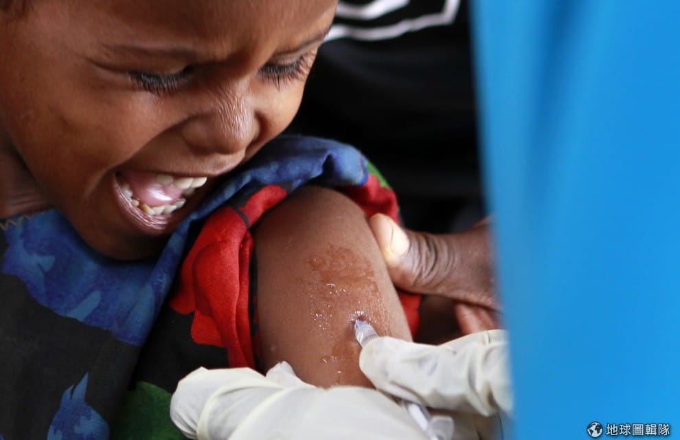 一名逃難到衣索比亞的索馬利亞小男孩正在接種麻疹疫苗,麻疹是一種好發於孩童的疾病,譚德塞認為他的弟弟當初就是死在麻疹。