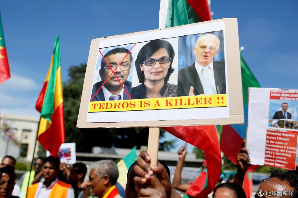 在WHO總幹事選舉期間,不乏衣索比亞示威民眾手舉標語和告示牌,要各國代表不要選譚德塞。圖中的三人像中,譚德塞的肖像被畫上紅色叉叉,中間的是巴基斯坦的心臟專家聶許達,右邊的則是英國公衛專家納巴羅,他們兩人都在選舉中敗給了譚德塞。