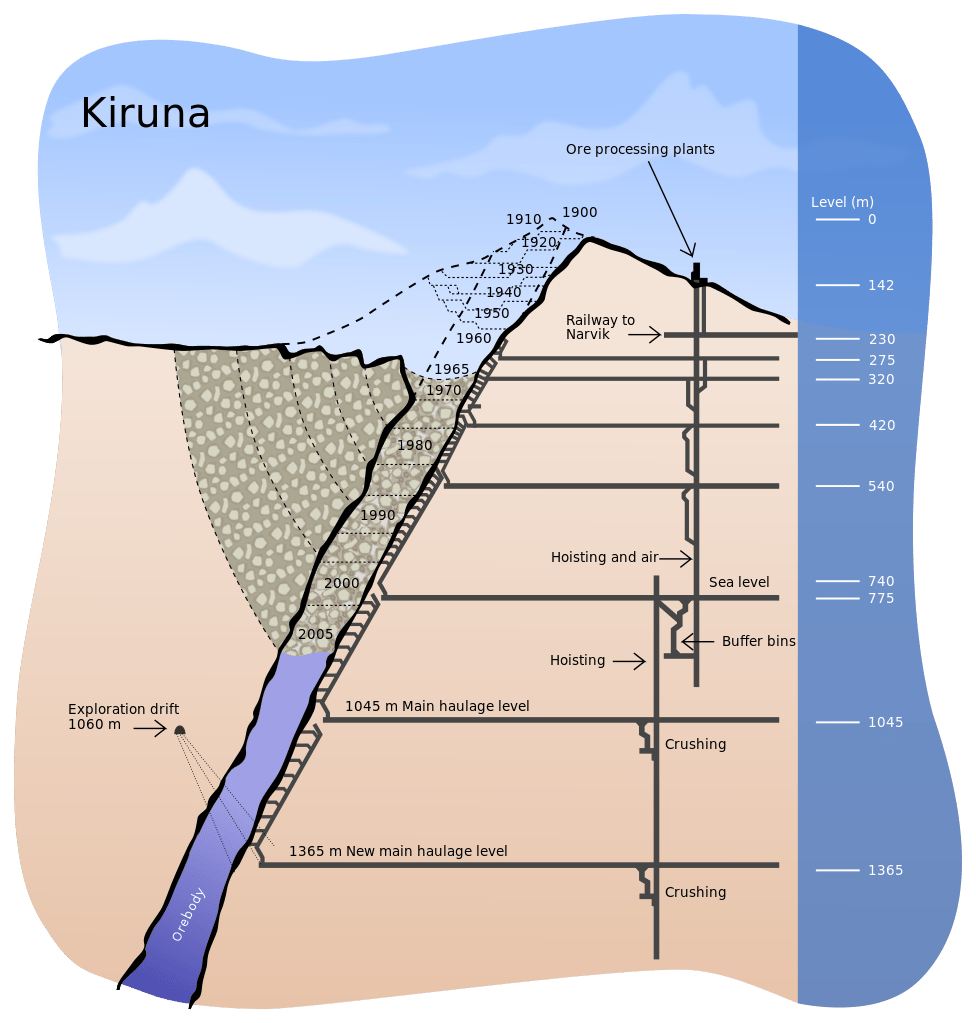 網友NASA International Space Stati以側面圖來看,可以看到LKAB的鐵礦區隨著時間經過越挖越深,並以 60度傾斜的開挖角度,逐漸波及到基律納鎮的地下。