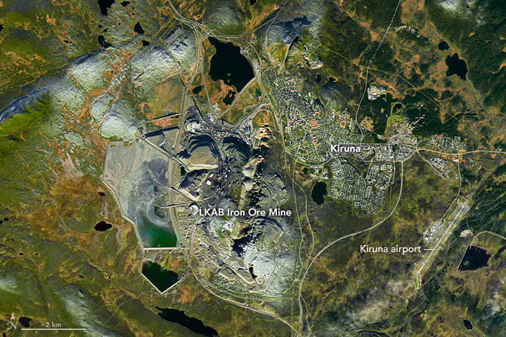 地球圖輯隊圖中可以看到LKAB的鐵礦區緊鄰著基律納鎮。