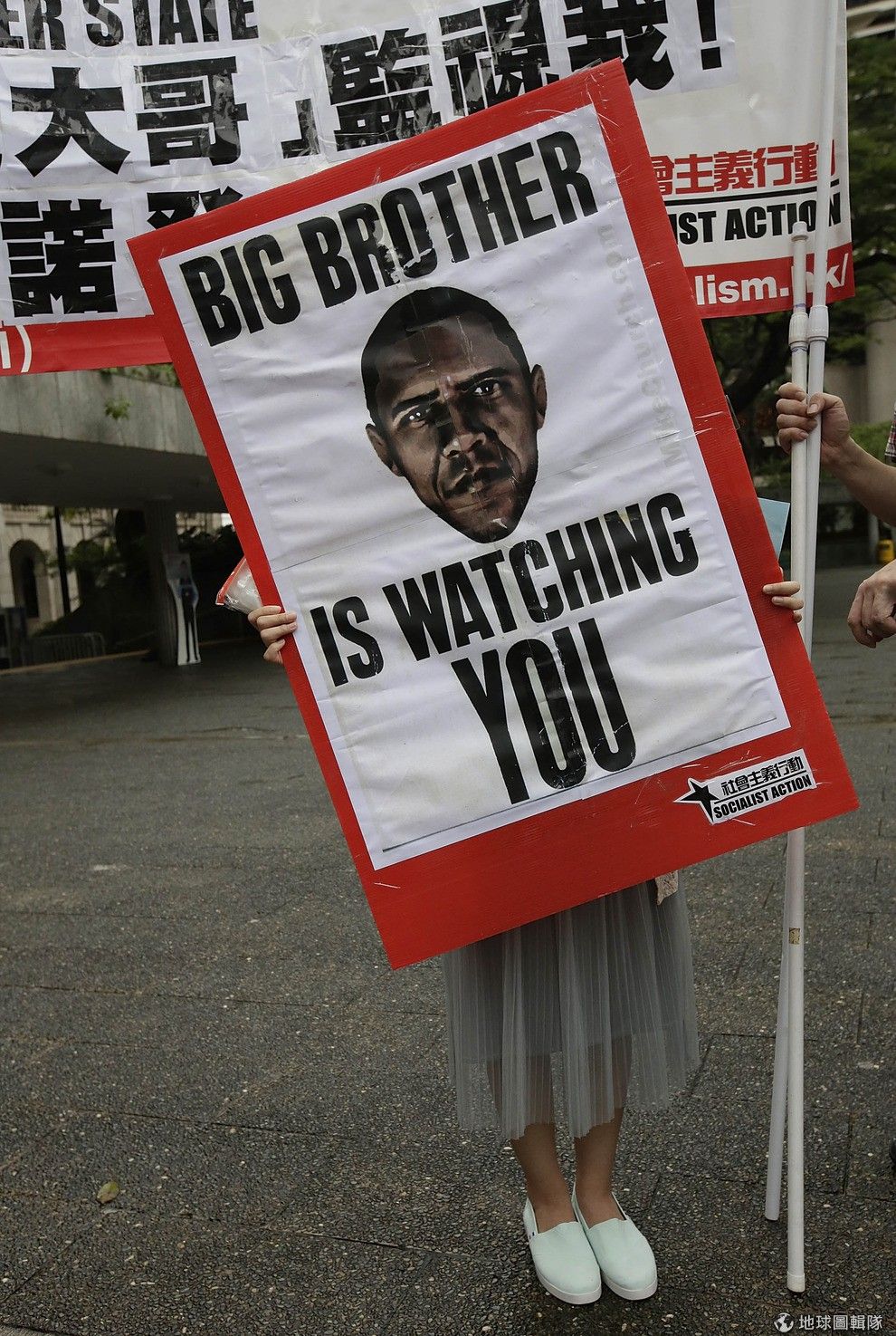 聲援史諾登的民眾高舉寫著「人權?」標語,表達對美國政府的不滿。