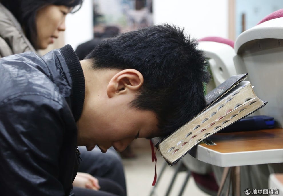 圖為一名頭頂聖經的脫北者,他正在虔誠地禱告,希望可以盡快和北韓的家人團聚。南韓年輕人因為就學、就業和家庭生活太耗費心神,越來越少人定期上教會。