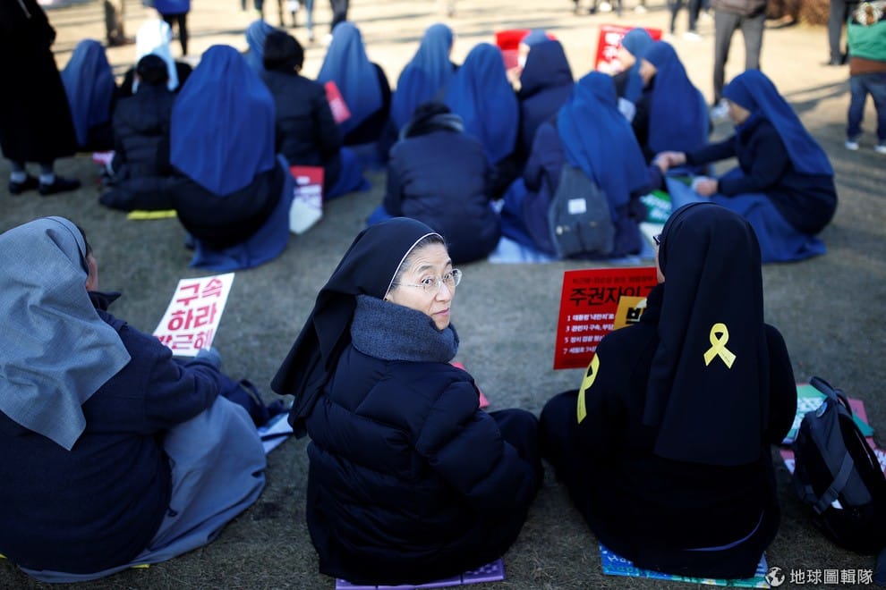 去年 12月,一群天主教修女齊聚首爾市中心,參加要前總統朴槿惠下台的倒朴活動。
