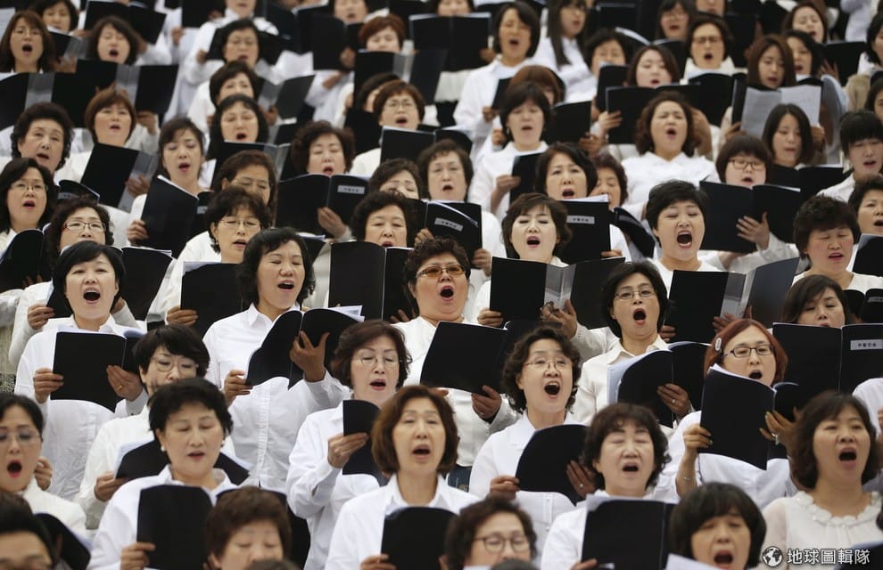 一群虔誠的基督徒高唱聖歌,慶祝一年一度的復活節彌撒。在南韓,教會就像企業一樣自成一個競爭的生態系,教會搶信徒的手段各式各樣。