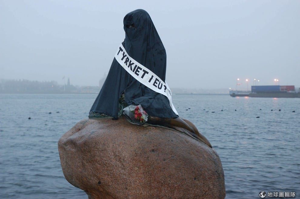 路透社2004年,小美人魚雕像被罩上了布卡,藉此抗議土耳其申請加入歐盟。
