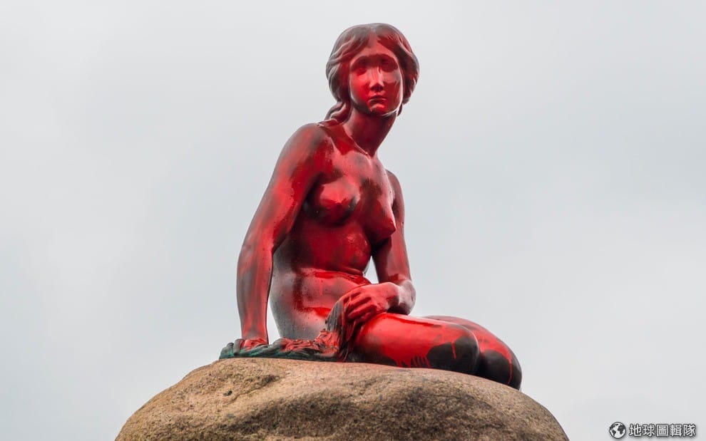 昨日(30),丹麥的小美人魚雕像被不明人士潑上紅漆,地面上則以紅字寫著:「丹麥,捍衛法羅群島的鯨魚們。」