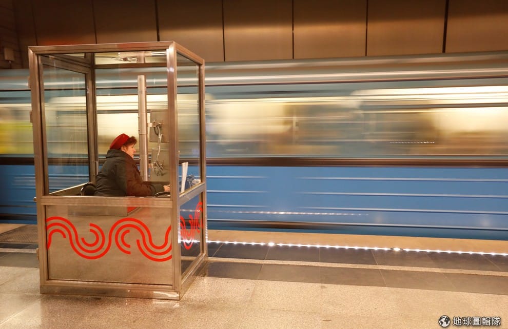 一名站務人員舉牌指示列車的離站,現在的莫斯科地鐵站可說新舊元素混雜的集合體。